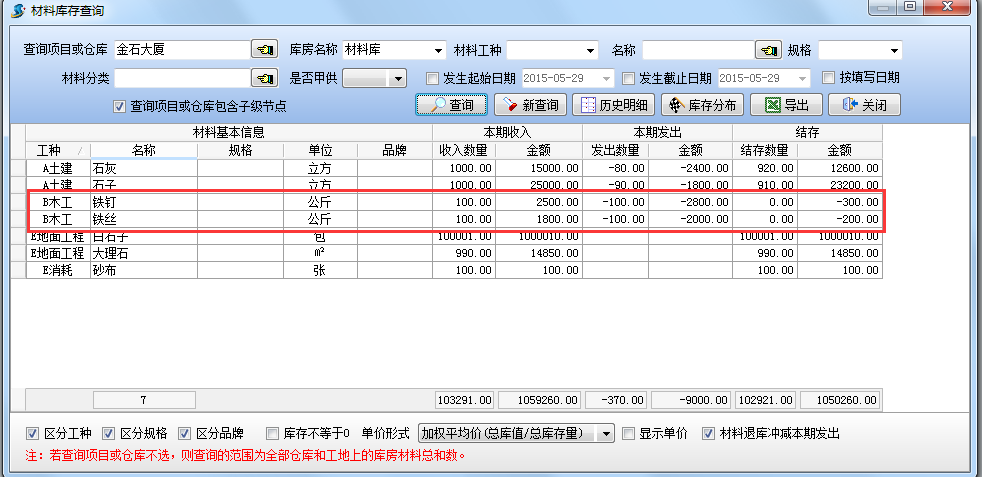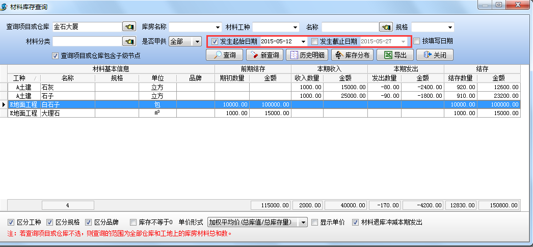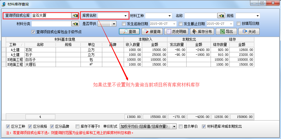 設置查詢項目為【金石大廈】,查詢結果如下圖:查詢當前項目【金石大廈】(包括所有庫房)的材料庫存情況。