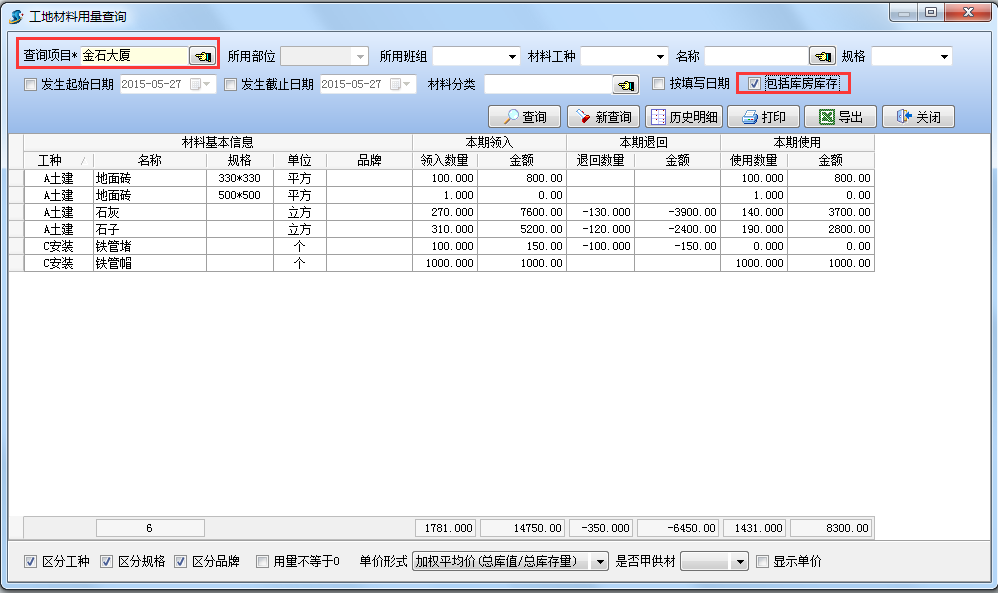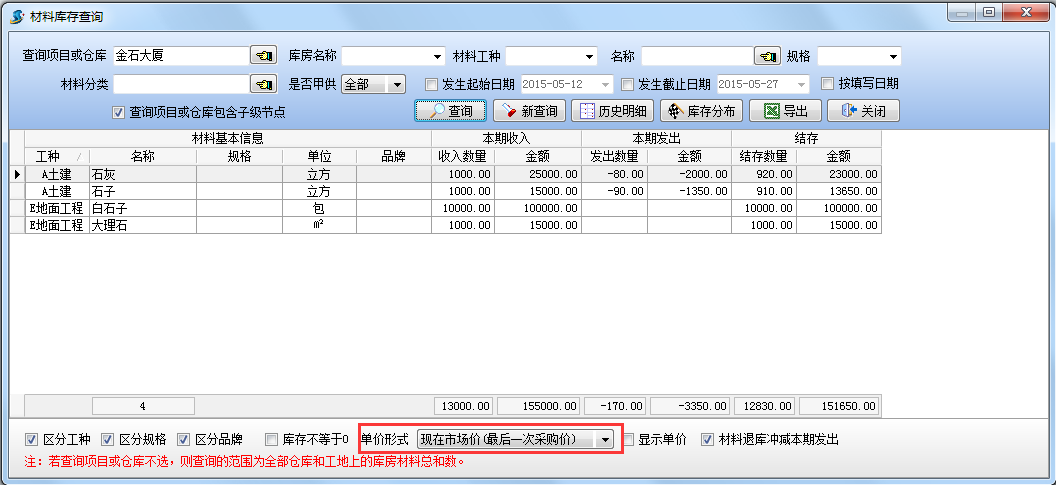 當單價形式設置為【最后一次采購價】進行查詢時,可以得出當前項目材料的庫存總值,如下圖: