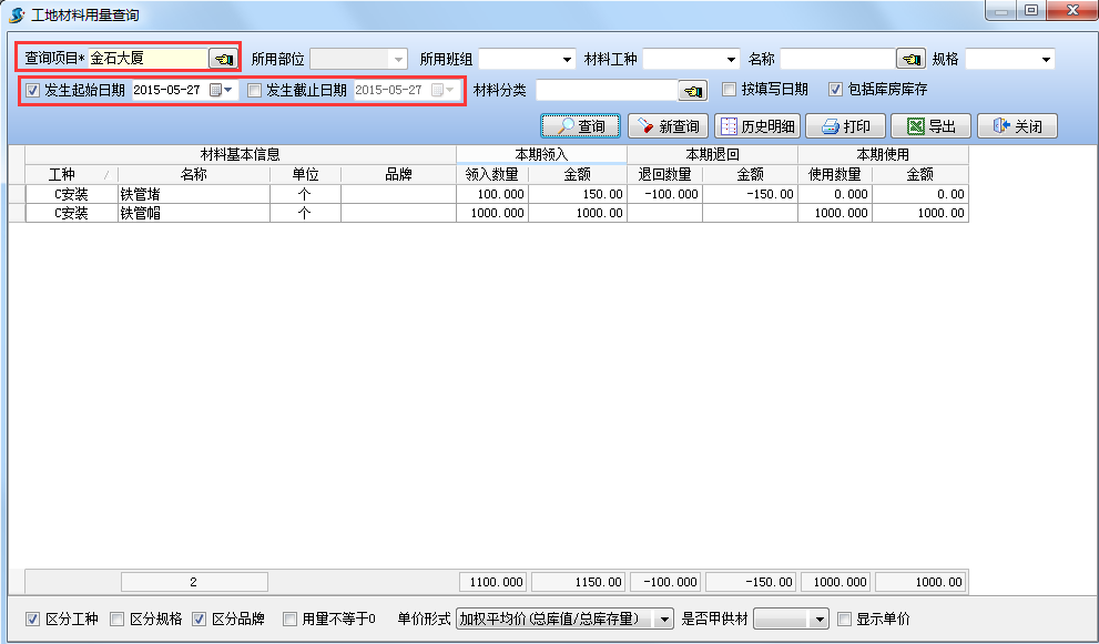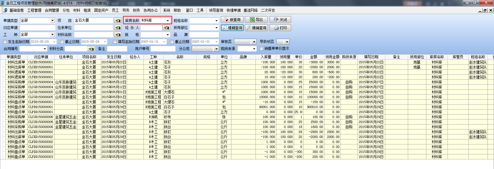 如下圖:查詢項目【金石大廈】下的庫房【材料庫】所有歷史記錄。