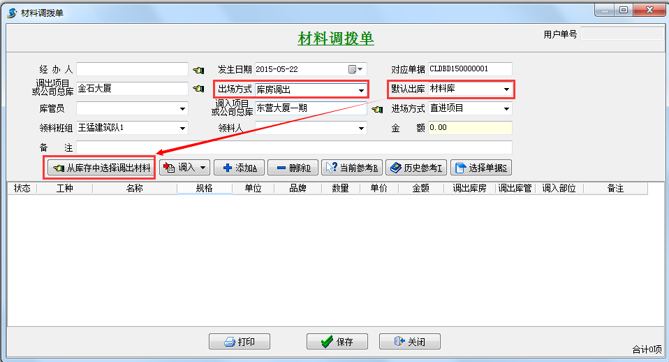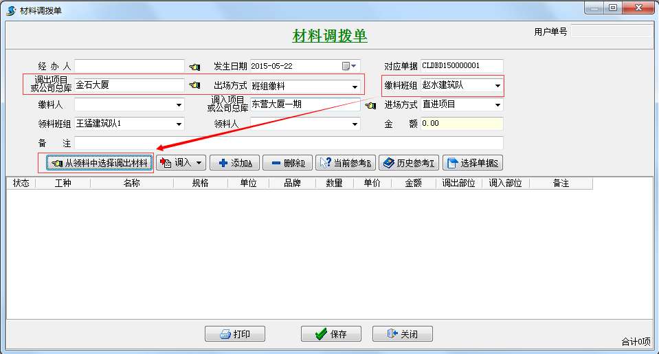 點擊主菜單【材料】->【材料調撥單】->【新建】打開界面如下: