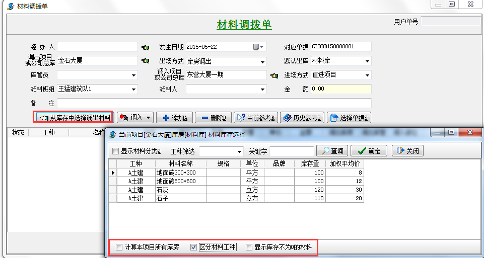 原【領料選擇】變為【庫存選擇】。再點擊【庫存選擇】前要先選擇好【庫房名稱】,如下圖:顯示當前庫房【材料庫】的庫存情況。通過【庫存選擇】可以讓用戶直接從材料庫存中調出材料,既提高效果、又避免出錯。
