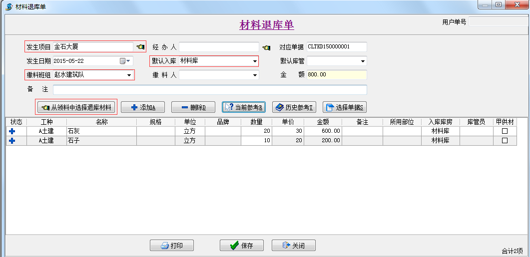 說明:該單據的功能界面類似【材料出庫單】,只不過本單據是記錄的退料的過程,具體操作可以參考【材料出庫單】。