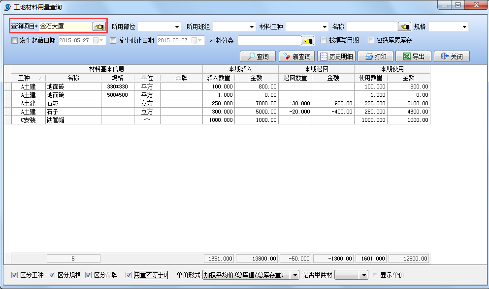 如下圖:查詢項目【金石大廈】所有石子的歷史明細,(通過【模糊查詢】)。