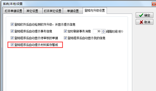 我們也可以設置登錄軟件時自動提示庫存警戒。設置好之后當材料的庫存量達到了預警設置中設置的上限或者下限,登錄時會自動彈出提示。