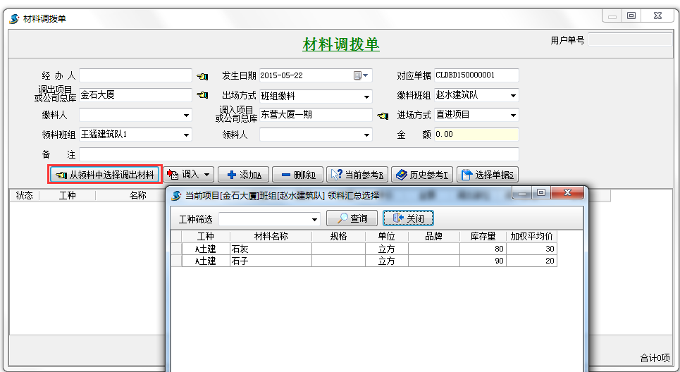 【材料調撥單】是當施工企業在工地現場材料管理中承接多項工程時,可能會需要把為某一工程購買的材料調撥給另一工程使用,將本公司的材料中轉庫的材料發到項目上,此時應填寫【材料調撥】單。錄入本單據前, 需先錄入要用到基礎信息中的【材料維護】、【項目維護】(包括【庫房信息】、【領料班組信息】)。