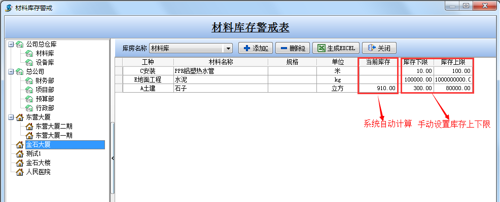 如下圖:選擇項目為【金石大廈】,庫房為【材料庫】后設置的庫存材料的上限、下限