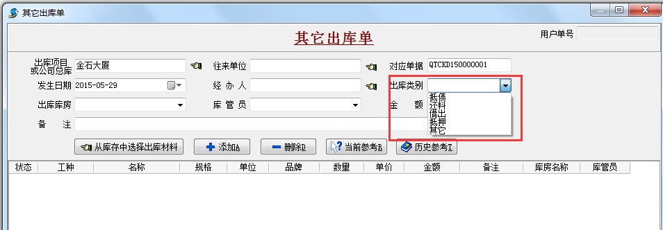 其它出庫單是指工地現場材料管理中其他方式的出庫,例如用于抵債,還料,借出,抵押等。錄入本單據前,需先錄入要用到【材料維護】、【項目維護】(包括【庫房信息】)。該單據影響【工程成本】、【工程材料成本對比】、【材料用量查詢】、【材料庫存查詢】、【項目材料總量、單平方用量對比表】、【材料庫存(項目用量)、采購量匯總表】