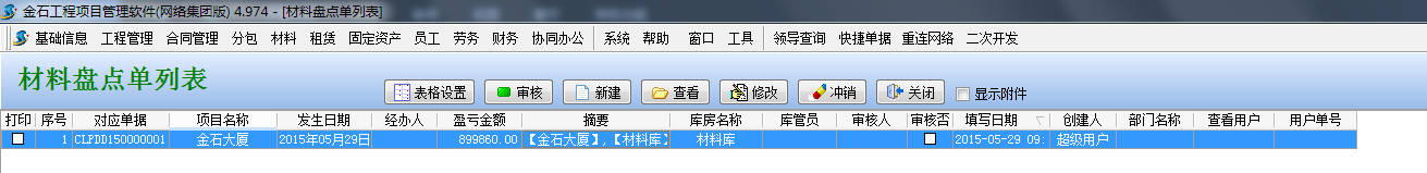 【材料盤點單】用來工地現場材料管理中重新盤點材料的實際庫存,當盤點的實際庫存與軟件庫存不符時,會產生盤點的盈虧數量、金額。從而影響系統中的材料庫存。一般該功能用于初期使用軟件建立庫存、或工程竣工重新盤點庫存。錄入本單據前,需先錄入要用到【材料維護】、【項目維護】(包括【庫房信息】)。