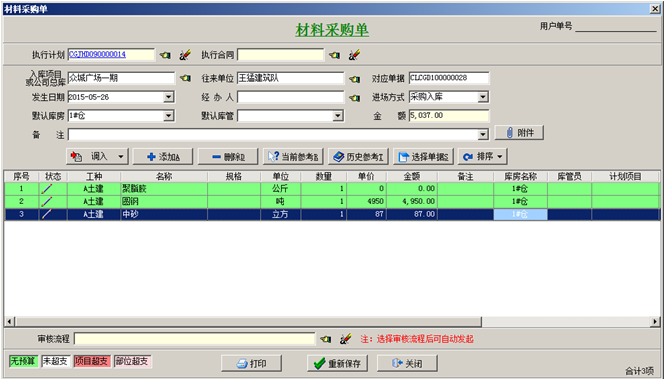3項目上報采購計劃,審核通過之后簽訂采購合同,然后執行采購入庫 (這種工程項目材料采購流程適合項目上需要有采購環節的采購) 如圖: