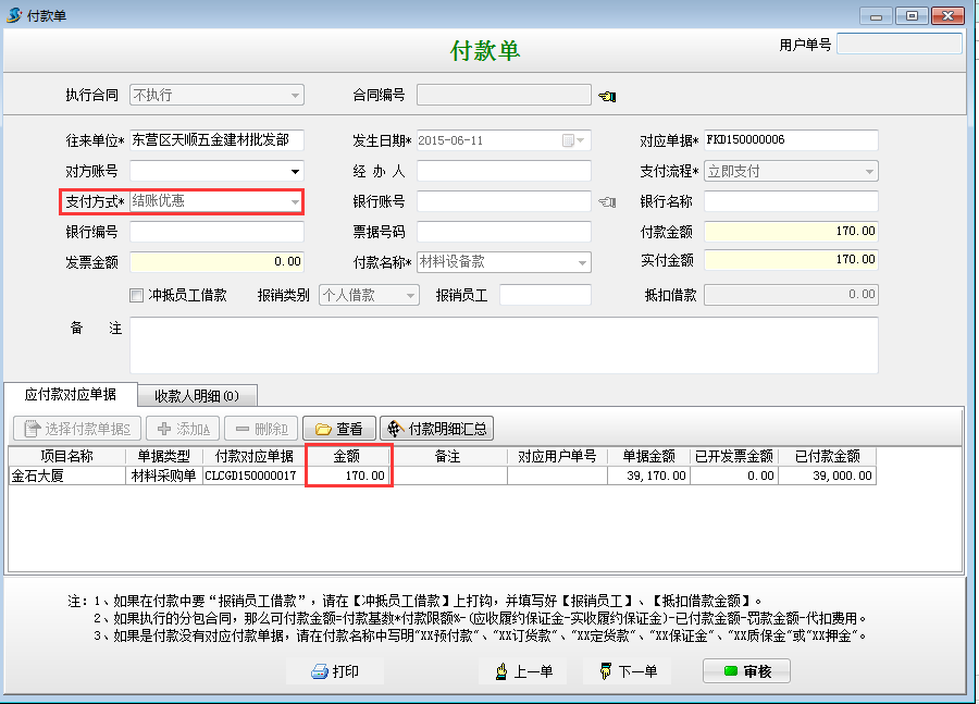 在工地項目管理系統中新建一個170的付款單,支付方式選擇結賬優惠。如下圖