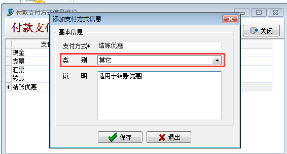 在工地項目管理系統中【財務管理】支付方式維護新建一個結賬優惠的支付方式,類別選擇其它,如下圖