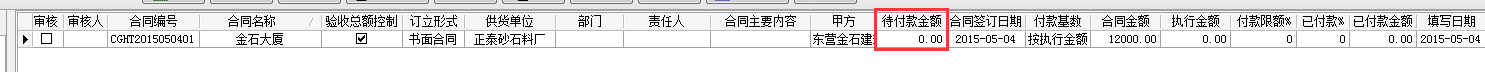 當(dāng)我們完成石子和石灰個(gè)100立方的驗(yàn)收后待付款金額則顯示驗(yàn)收金額。如下圖: