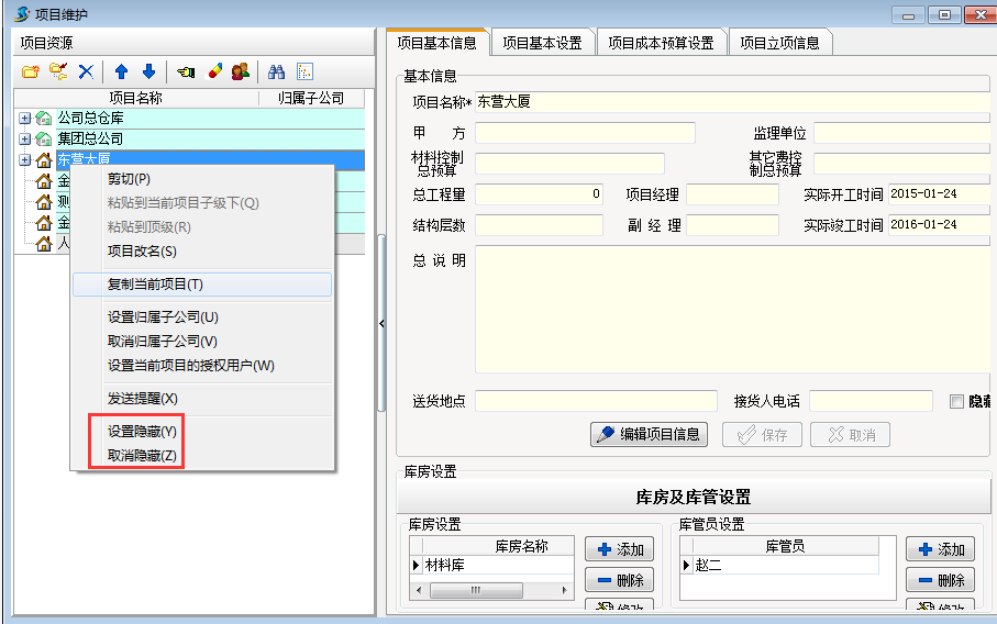 工程管理-項目維護-選中項目右鍵設置隱藏或者取消隱藏。 如下圖: