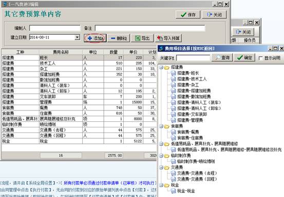 在預(yù)算單中,點(diǎn)【添加】按鈕就會彈出之前設(shè)定好的科目,以供我們選擇使用。添加完成后,點(diǎn)保存按鈕進(jìn)行保存。保存完成后,我們可以在工程管理模塊【項目維護(hù)】中進(jìn)行預(yù)算與項目綁定。