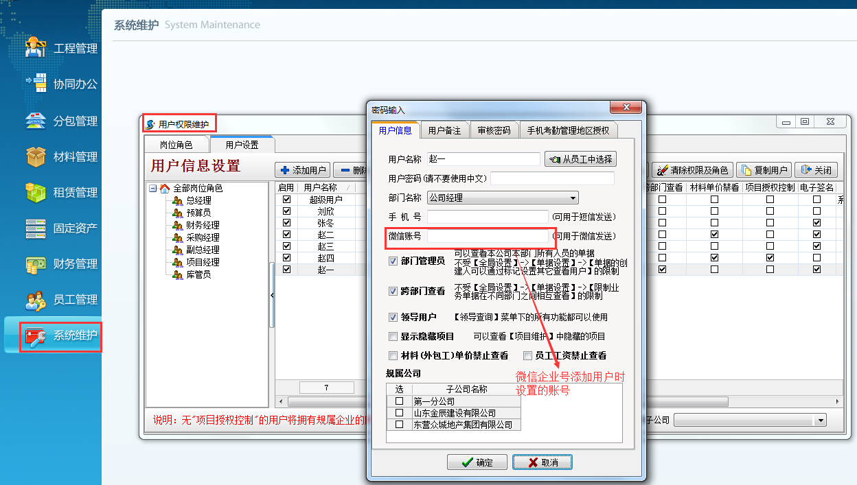 ⑶ 在金石軟件【系統維護】-【用戶管理權限設置】中設置每個使用用戶的微信賬號。如下圖:
