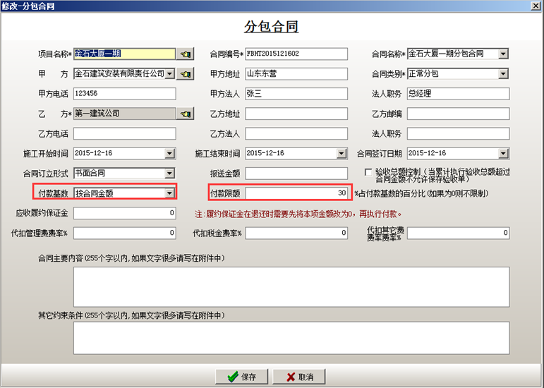 新建分包合同,在付款基數選擇“按合同金額”(統計成本是可按照合同金額統計成本),并輸入付款限額。如圖所示:
