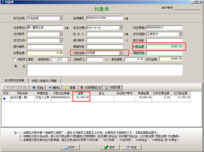添加“付款單”,付款名稱為“預付款”、對應好合同編號、輸入付款金額,如圖所示: