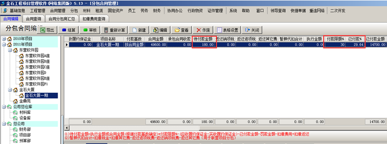 合同內容導入系統之后,系統會計算合同金額以及代付款金額。如圖: