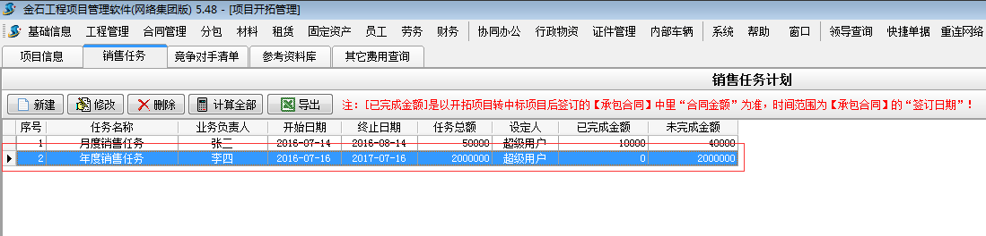 施工項(xiàng)目管理軟件【項(xiàng)目開(kāi)拓】-【銷售任務(wù)】是用來(lái)管理企業(yè)給業(yè)務(wù)員設(shè)定銷售任務(wù)計(jì)劃的模塊。