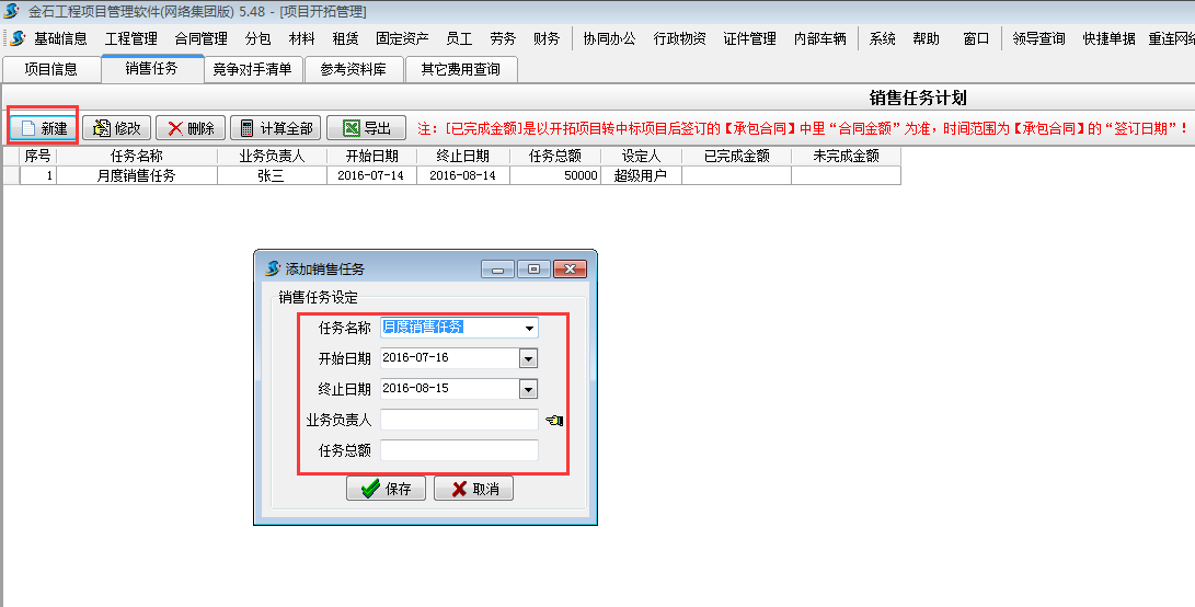 首先在施工項(xiàng)目管理軟件【項(xiàng)目開(kāi)拓】-【銷售任務(wù)】處新建銷售任務(wù)計(jì)劃。如下圖: