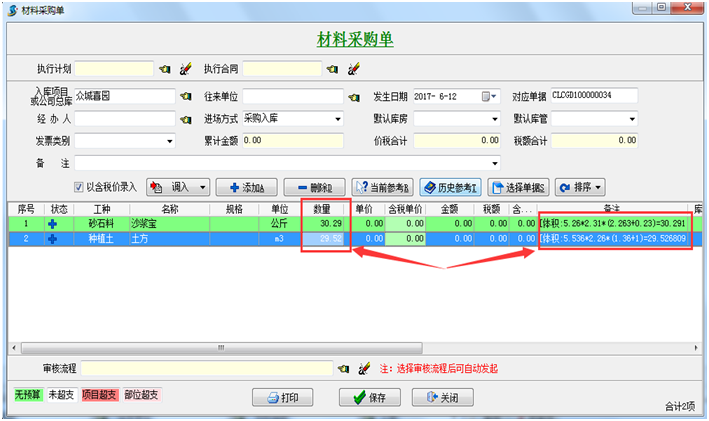 備注 如上圖所示:在備注欄中系統(tǒng)不但會(huì)自動(dòng)彈出材料的計(jì)算方式,而且在數(shù)量一欄中只保留2位小數(shù),并將第三位以后的數(shù)字舍去,以幫助公司節(jié)省開(kāi)支