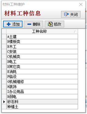 1、在材料工種維護(hù)維護(hù)中添加工種(砂石料、種植土)如下圖: