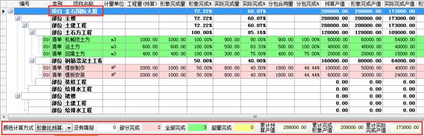 對于某些工程,高水平的項目經(jīng)理可以把實際完成量做小,需要的達到的效果是“實際干的進度小于向甲方上報的進度”。在金石軟件中能很好地體現(xiàn)“實際進度”、“形象進度”兩個概念,在進度填報過程中可以將“實際進度”、“形象進度”分別填報。并且將清單“甲方合同量”、“分包合同量”、“形象完成量”、“實際完成量”四者的關(guān)系完全展現(xiàn)在一起。