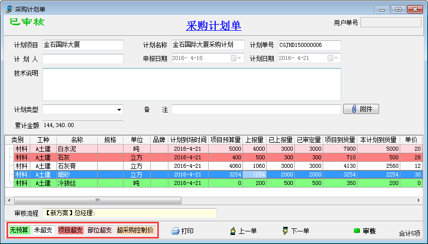 只要項目設(shè)置好材料控制預(yù)算,具有該權(quán)限的人員登陸系統(tǒng)后會顯示所授權(quán)項目材料超用情況。