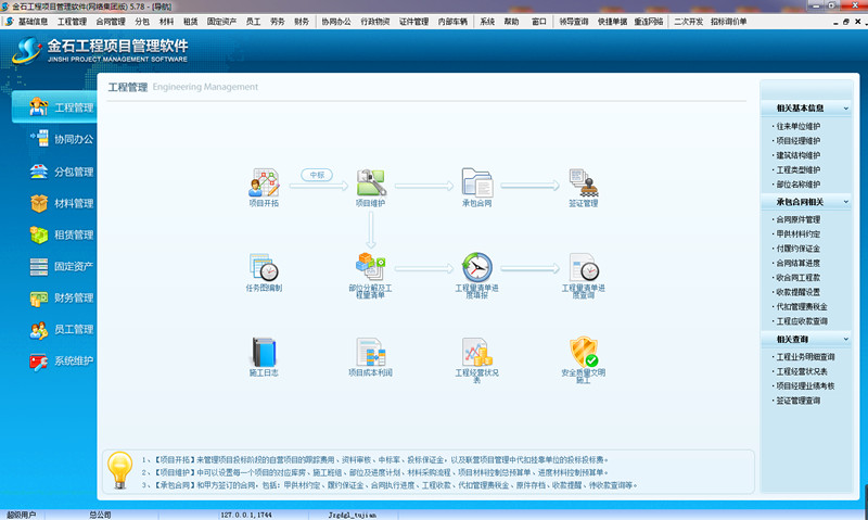 本軟件是金石軟件公司以眾多施工企業(yè)管理現(xiàn)狀為出發(fā)點,深入了解施工現(xiàn)場,經(jīng)過七年地不斷完善與努力,打造成為一款成熟、靈活、實用性極高的信息化內(nèi)控管理平臺。軟件以成本控制為核心,以資金管理為主線,全面解決項目管理難題,提升項目管控能力。對工程的投標(biāo)管理、中標(biāo)后的進度管理、分包管理、采購招標(biāo)、材料管理、租賃管理、固定資產(chǎn)管理、員工管理、勞務(wù)管理、資金管理、押金管理、發(fā)票管理、稅金核算、聯(lián)營管理、文檔資料管理、物資管理、安全質(zhì)量管理、證件管理、車輛管理、工程結(jié)算、等進行全方位管理,并提供強大的OA功能,能夠?qū)崿F(xiàn)各部門之間的數(shù)據(jù)共享及業(yè)務(wù)單據(jù)網(wǎng)上簽批審核。并且提供了強大的自定義工作流驅(qū)動和各種流程開關(guān),企業(yè)可根據(jù)自己情況自行設(shè)定,從而規(guī)范企業(yè)管理、讓工作流程正歸化、簡單化。通過工作流,讓信息送審、審批更貼近日常公司管理模式,申請人可隨時看到當(dāng)前業(yè)務(wù)的審批進度和各領(lǐng)導(dǎo)的審批意見。