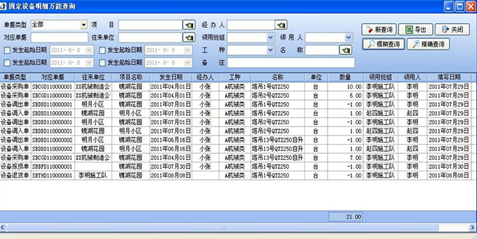 設(shè)備使用記錄功能主要由固定設(shè)備萬能查詢模塊實(shí)現(xiàn)。該模塊由相關(guān)機(jī)械設(shè)備負(fù)責(zé)人主持,在設(shè)備領(lǐng)用時登記相關(guān)信息,包括不限于:該設(shè)備對應(yīng)單據(jù)編號、往來的單位、設(shè)備調(diào)撥的歸屬項目,使用日期、登記信息的責(zé)任人、設(shè)備類別、具體的名稱、數(shù)量、領(lǐng)用班組、領(lǐng)用人、填表時間等信息。