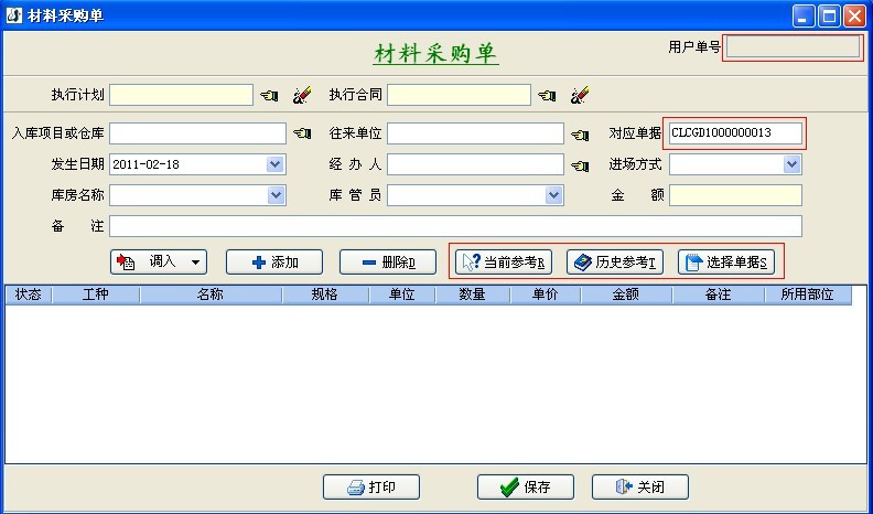 【選擇單據(jù)】:根據(jù)歷史發(fā)生的同類(lèi)單據(jù)再次選擇,提高錄入效率。如:在【材料出庫(kù)單】中可以通過(guò)【選擇單據(jù)】調(diào)用【材料采購(gòu)單】的入庫(kù)單明細(xì),即要填寫(xiě)的出庫(kù)材料直接從采購(gòu)入庫(kù)的材料中選擇出來(lái)。