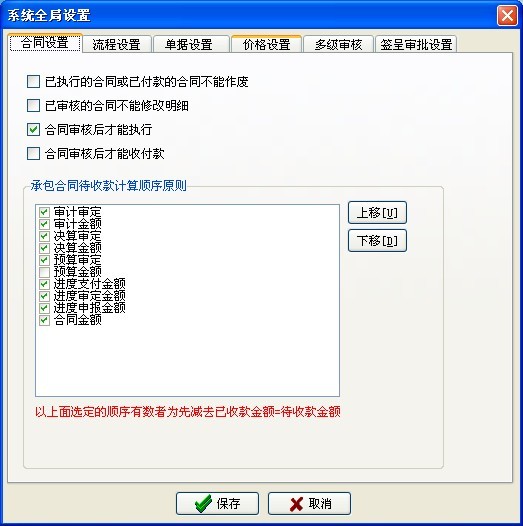 四、進(jìn)行【全局設(shè)置】,用戶要根據(jù)自己公司的實(shí)際情況進(jìn)行設(shè)置,多余的控制流程要去除,需要的要打鉤。如下圖: