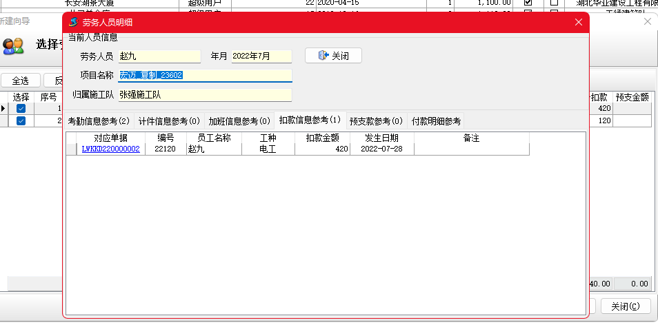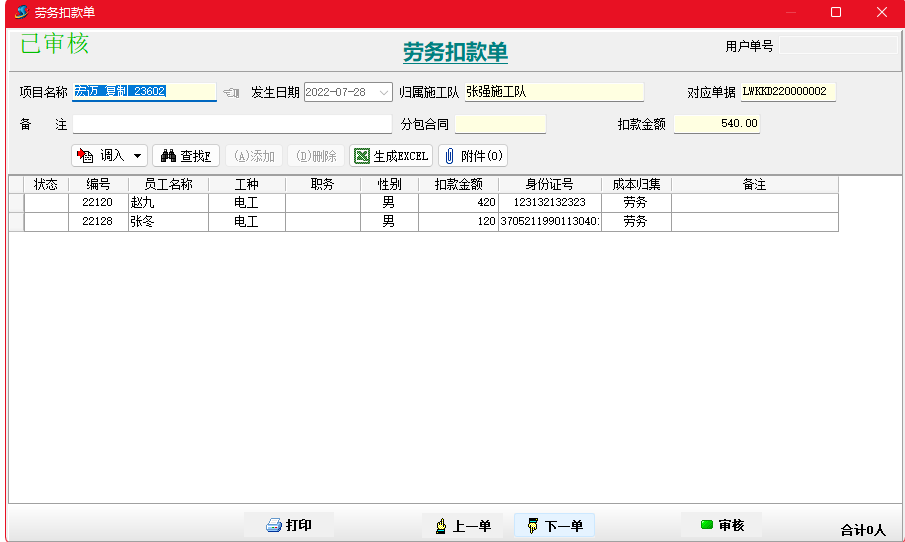 金石項目管理軟件增加勞務扣款單,可以按人填寫勞務工人扣款信息,并生成勞務工資表。