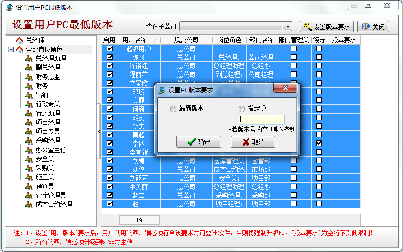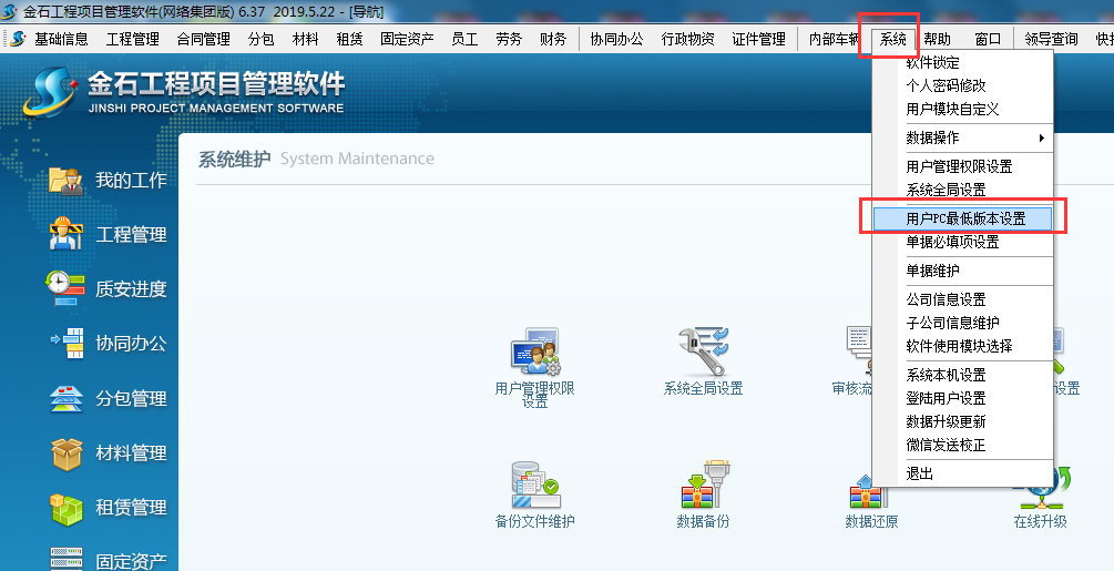 在使用金石工程項目管理軟件的過程中經常會碰到有的同事升級了較新版本的新功能,其他同事還在使用老版本不能更好的體驗金石軟件新功能,在6.35版本中我們對此進行了限制,可要求所有用戶均升級最新版本或指定的版本,否則系統將將強制升級,操作流程如下: