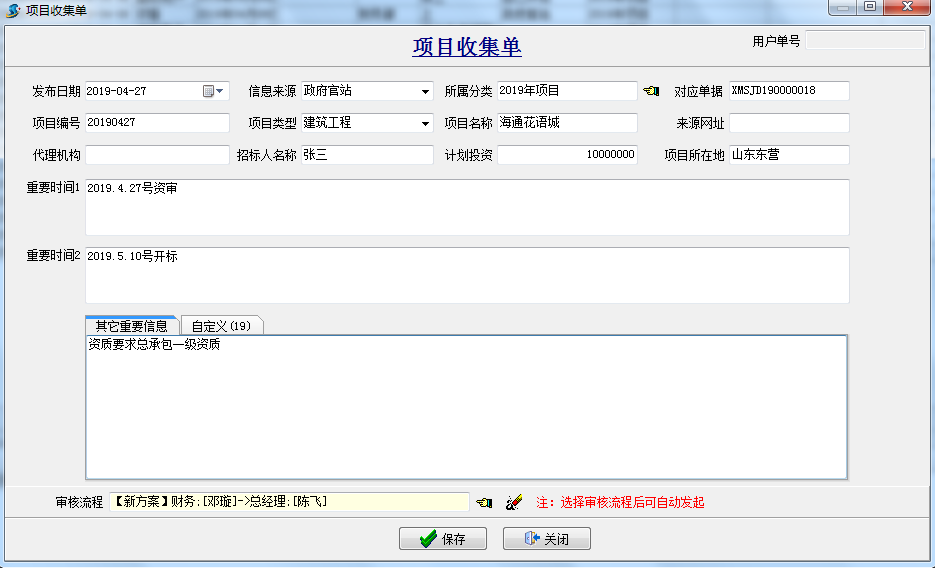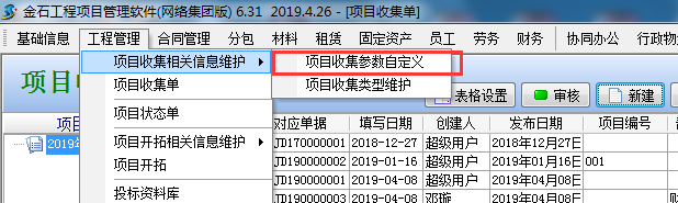 以上內(nèi)容基本可滿足大部分公司的需求詳細(xì)操作流程請(qǐng)見前期的文章“項(xiàng)目收集單”,對(duì)于一些要求前期階段更加細(xì)致化的公司,金石軟件內(nèi)也預(yù)留了項(xiàng)目收集單自定義功能,操作流程如下: