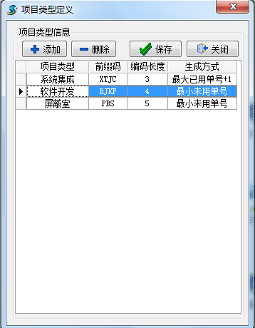 ①點(diǎn)“添加”按鍵增加豎列; ②“項(xiàng)目類型”輸入需要的項(xiàng)目類型; ③“前綴碼”列輸入自動(dòng)流轉(zhuǎn)的項(xiàng)目編號(hào); ④“編碼長(zhǎng)度”列為不含前綴的數(shù)值長(zhǎng)度;
