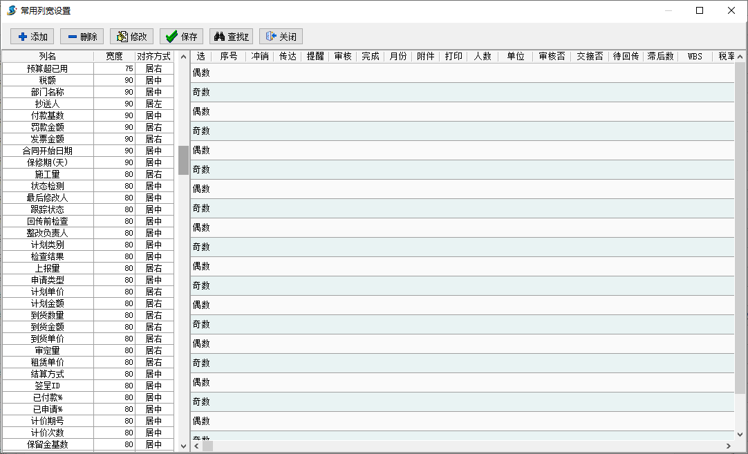 六、常用列寬設置 - 對列表或查詢表格中不同字段的列寬做單獨設置,分字段名、寬度和對齊方式3種設置,字段名必須與列表或查詢表格中的字段名一致,否則無法生效;寬度為字段的顯示寬度,原則為恰好或更好顯示當前字段內容為準;對齊方式分居中、居左和居右3種方式,原則上推薦數字類居右顯示,其他字段可根據用戶個體習慣自行設置,設置界面圖如下: