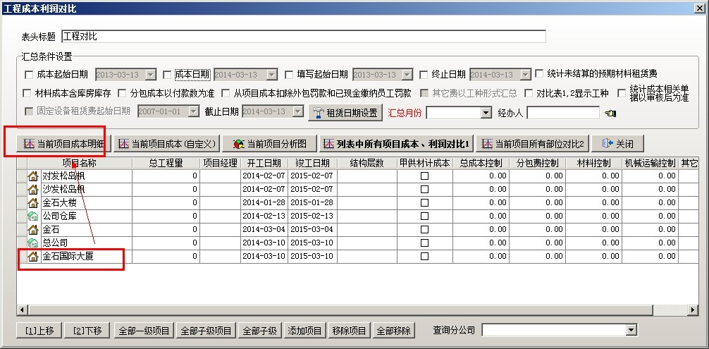 打開項目成本利潤,選擇要查詢的項目,點擊當前項目成本明細(也可以在系統全局設置中自定義項目成本利潤表,在查看成本利潤的時候,選擇第二項,當前項目成本(自定義))