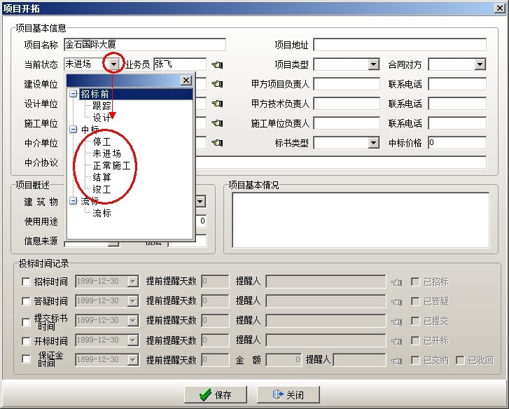 (1)需要再回到【項目開拓】中修改項目開拓的狀態為中標的狀態(中標下的五個狀態任選一項),然后保存