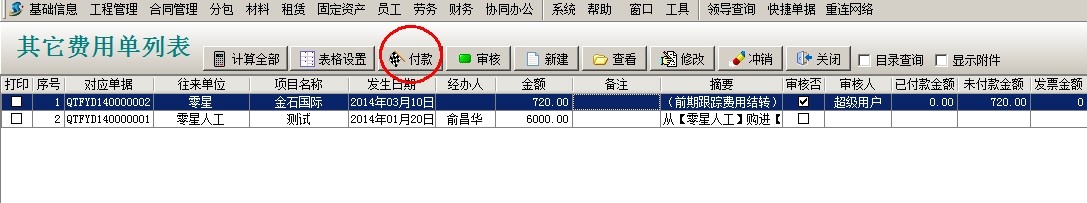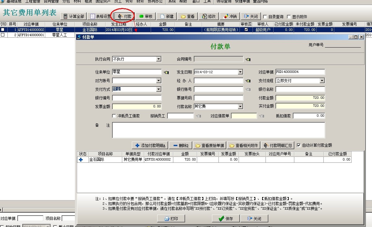 選中單據點擊付款,選擇支付方式,點保存。項目開拓中可以查看到該投標項目發生的費用