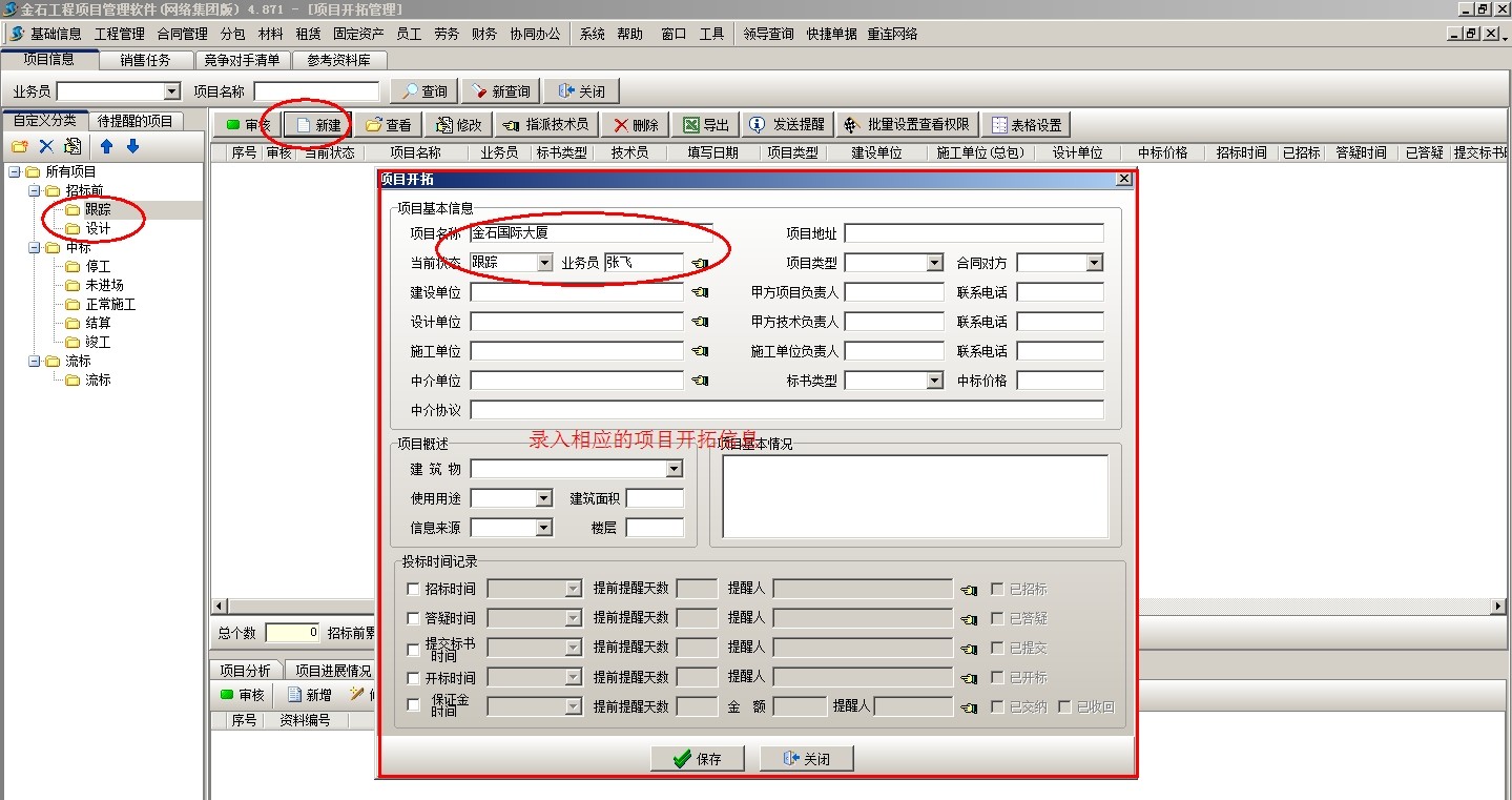 1、項目立項后,首先到【項目開拓】新建項目,注意選擇項目相應的狀態(必須為招標前),然后錄入項目的基本信息,如下圖:
