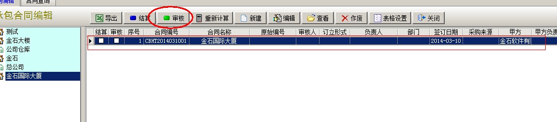左邊選中新建的項(xiàng)目名稱金石國際大廈,右邊點(diǎn)擊新建,彈出新建承包合同窗口,錄入合同基本信息,填寫合同履約保證金金額,然后保存。